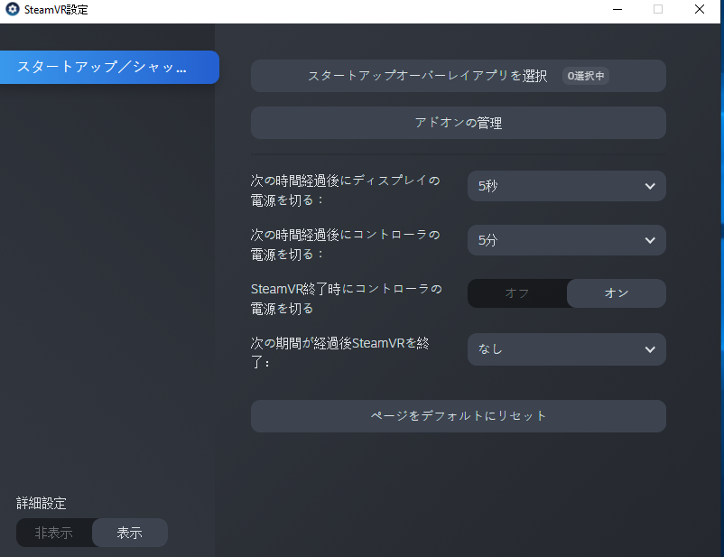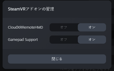 - SteamVRにCloudXRプラグインがインストールされていることを確認するには、詳細設定オプション内のアドオンの管理ページに移動します。アドオンとしてCloudXRRemoteHMDがリストアップされ、ONに設定されていることを確認します
