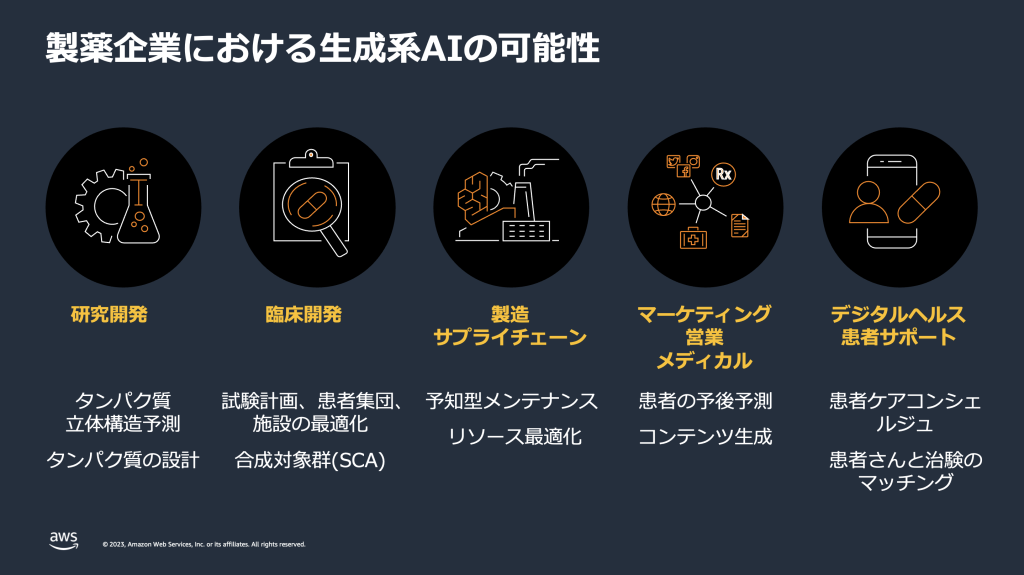 生成系AIの特徴は、この基盤モデルを利用し、様々なAIアプリケーションを開発することができることです。生成系AIの一つであるChatGPTは、膨大なテキストデータを学習したLLMであり基盤モデルの応用の一つです。このようなLLMを利用した生成系AIは、分類、編集、要約、質問への回答、新しいコンテンツの下書きなどの作業を行うことができるため、特にビジネス利用での期待が高いと考えられています。この寄稿では3回に分けて、製薬企業でLLMの効果が大きく期待できる業務部門を四つに分け、情報の検索・抽出、チャットボット、SOP(Standard Operating Procedure)ほか各種文書などドラフト作成、社内ガイダンスとの検証といった様々なユースケースについて整理し、AWSが提供する生成系AIサービスと共に解説していきます。