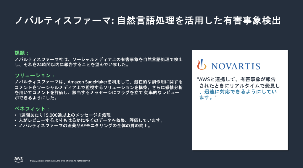 この課題に対して、AWSを活用する顧客の1社であるノバルティスファーマでは、自然言語処理(NLP:Natural Language Processing)を使用したプログラムを開発することで有害事象(AE)の検出能力を上げることに取り組んでいます。AI・MLを利用した検知プログラムによってSNS内の潜在的なAEの記載をモニタリングし、AEと疑わしい文章が自動的に検知された場合には、さらに感情分析を用いて内容を評価しています。該当したメッセージ部分にはフラグを付けて分析の結果を表示し、社内での効率的なレビューを可能にしています。