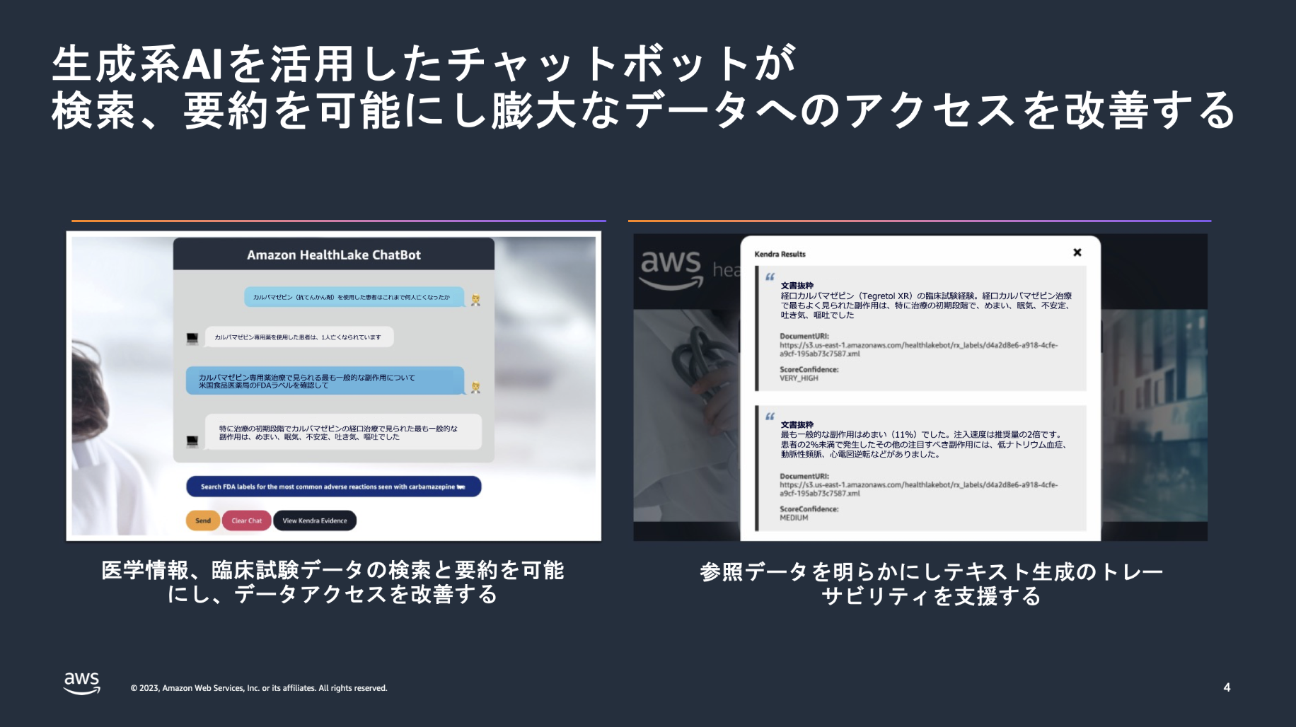 本記事は、製薬企業における大規模言語モデル ( LLM ) の効果が大きく期待できる様々なユースケースについて業務部門毎に整理し、AWS が提供する生成系 AI サービスと共に解説する 3 部構成のシリーズの 2 つ目のブログ記事です。パート1 では、臨床開発でのデータクリーニング作業、メディカルライティングを始めとした文書業務の効率化について、ファーマコビジランス部門での AI アプリケーションを利用した SNS 上の有害事象を検知について説明しました。パート 2 では、メディカルアフェアーズ部門での社内レビュー業務の効率改善、マーケティング部門における医療関係者向け、患者さん向けの生成系 AI チャットボットの有用性ついて説明します。