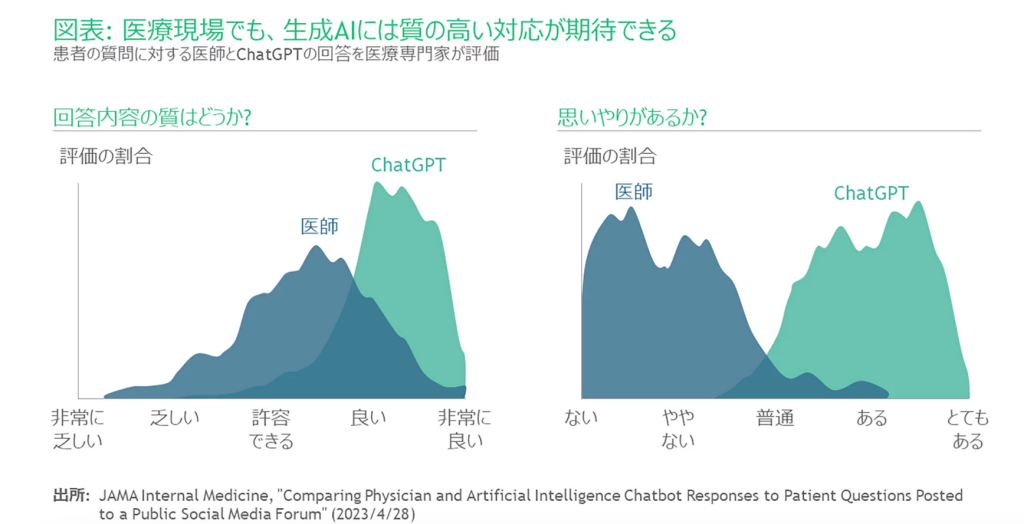 この研究では、医療系 SNS に患者から寄せられた質問 195 件をランダムに抽出し、医師の回答と生成系 AIの回答を「回答された情報の質」「文章から受ける思いやり」の二つの観点から評価し、比較検討しています。評価は 5 段階で( 1 が最も悪く、5 が最も良い)医療専門家が行っています。