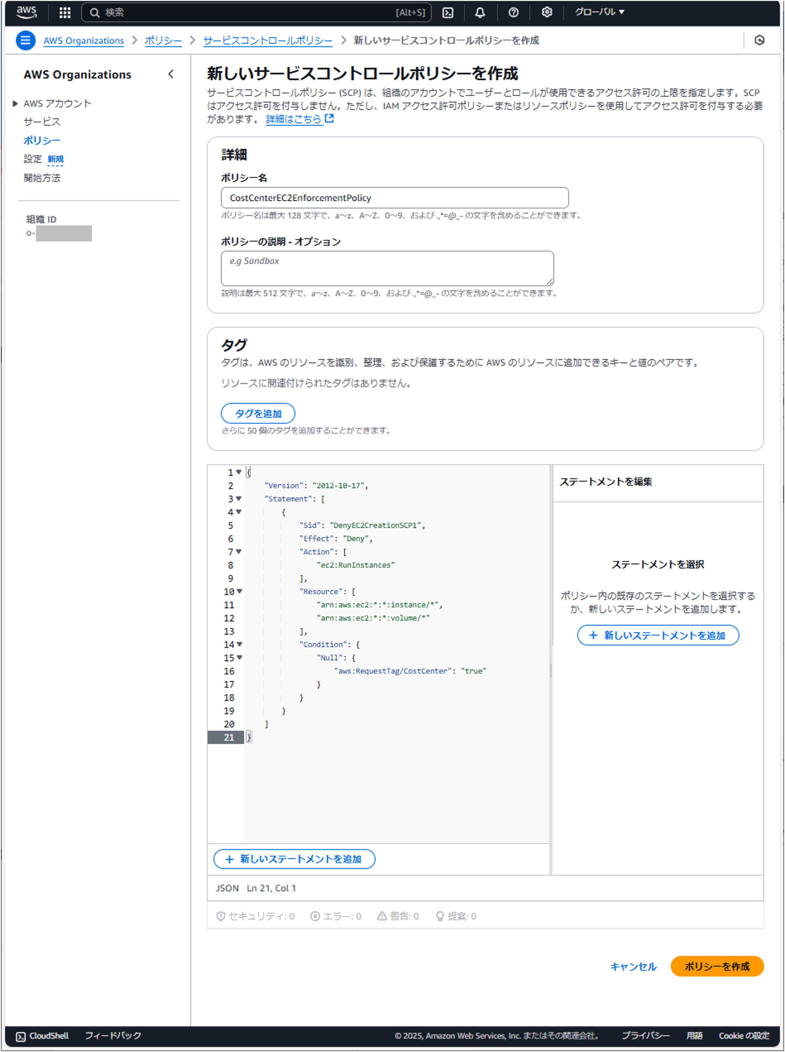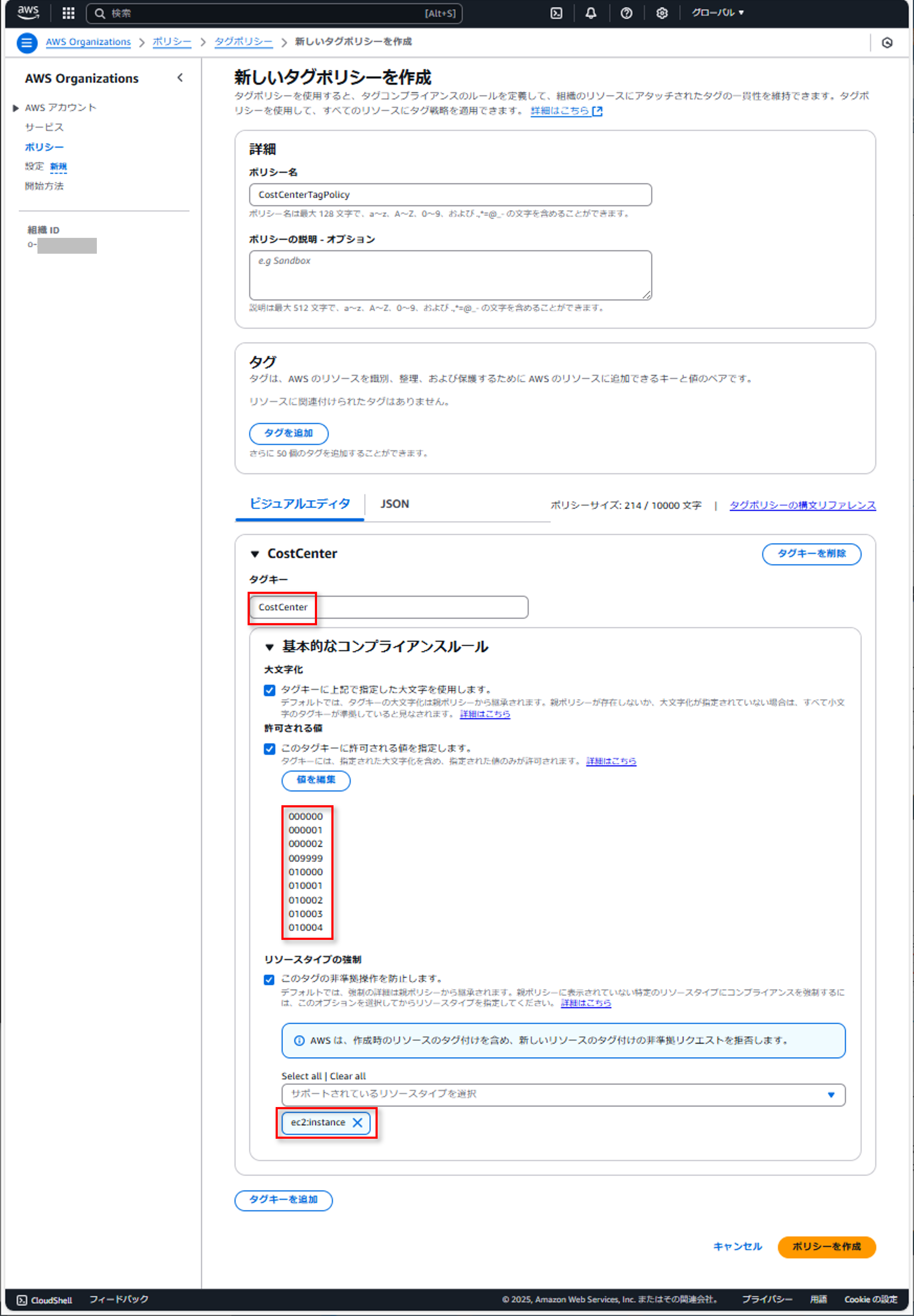 2. 次に、上記の例で定義した値を使用して、CostCenter タグのタグポリシーを作成します。このポリシーを Amazon EC2 インスタンスに適用し、組織によって指定された値でなければ、CostCenter タグを使用してリソースを作成することを禁止するようにします。