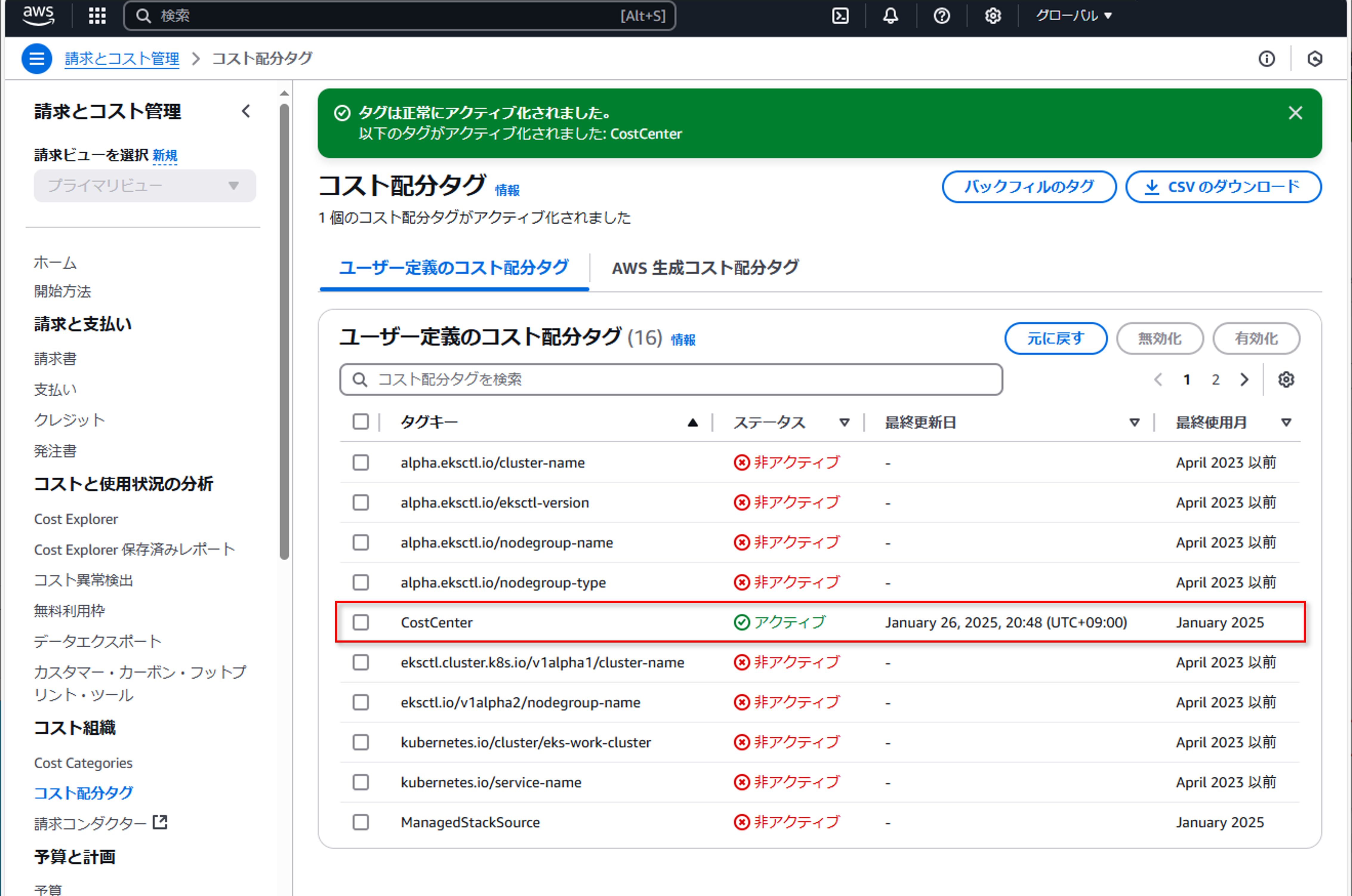 コスト配分タグを有効化する