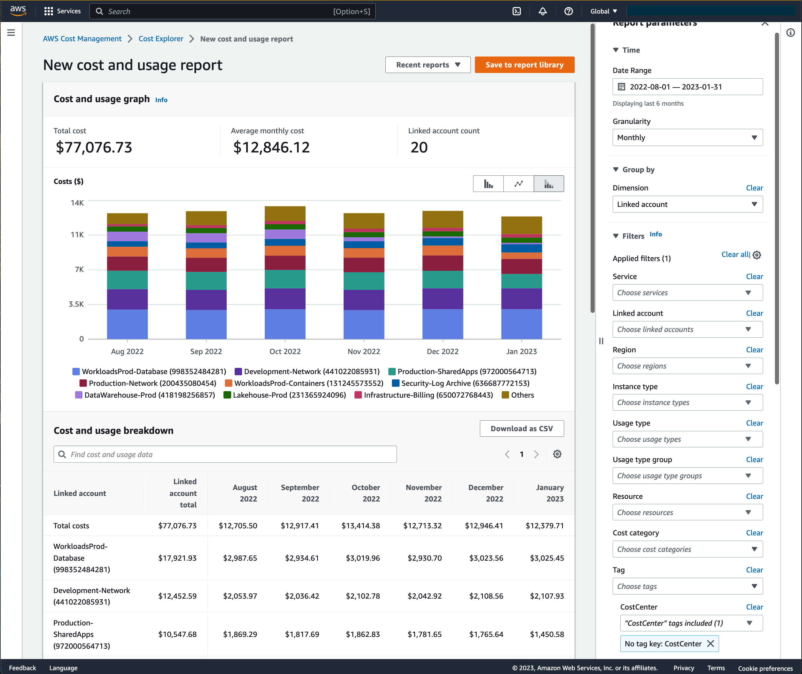 Cost Explorer を使用すると、適切な CostCenter タグが関連付けられていないアカウントのうち、最も支出が多いアカウントを分析できます。これを行うには、ディメンションを “連結アカウント (Linked Account)”、タグのフィルターを “CostCenter”、およびタグ値を “タグキーがありません :CostCenter (No tag key: CostCenter)” に設定した Cost Explorer レポートを作成します。