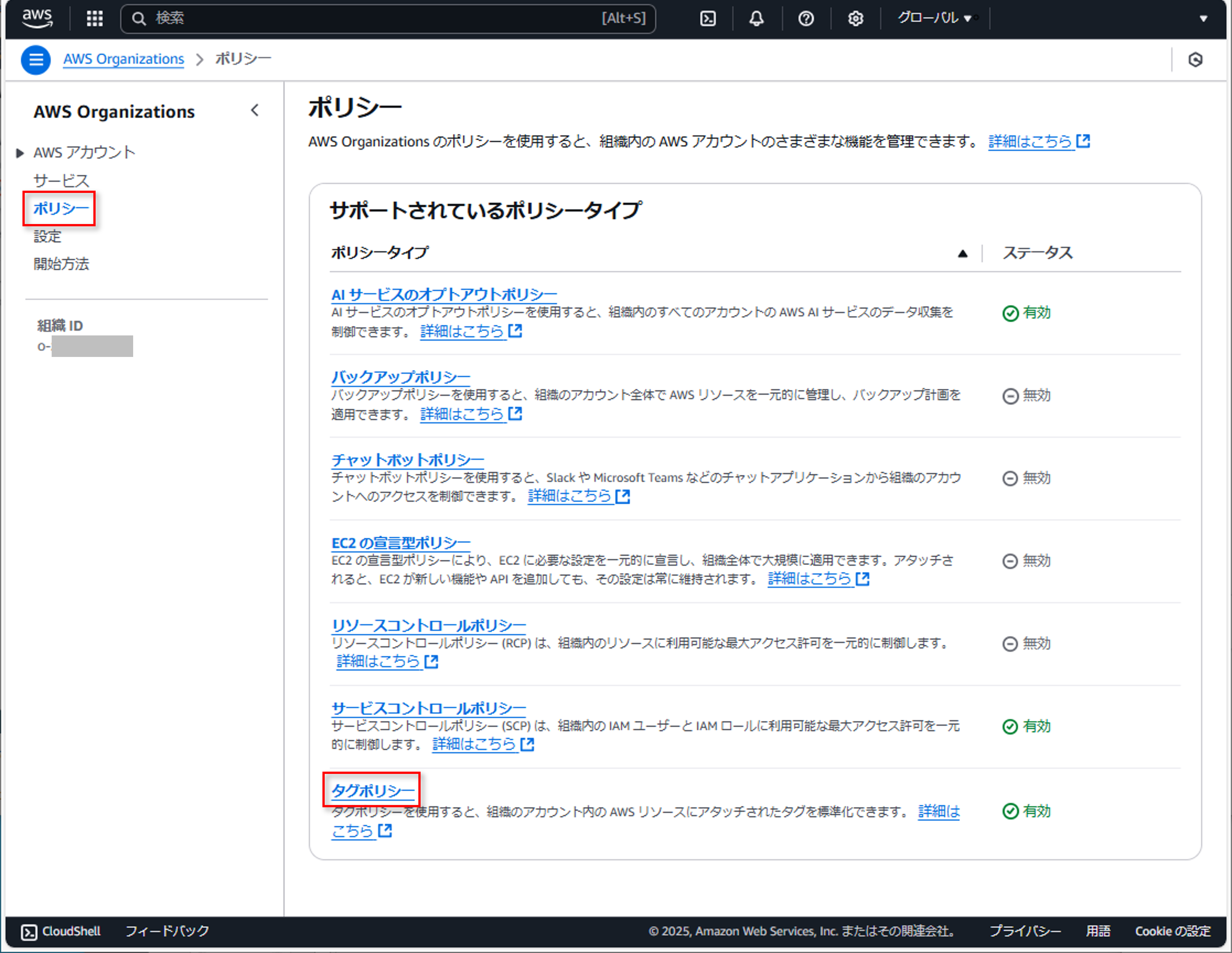 1. まず最初に、管理アカウントの AWS Organizations コンソールに移動し、[Policies (ポリシー)] を選択します。次に [Tag policies (タグポリシー)] をクリックします。