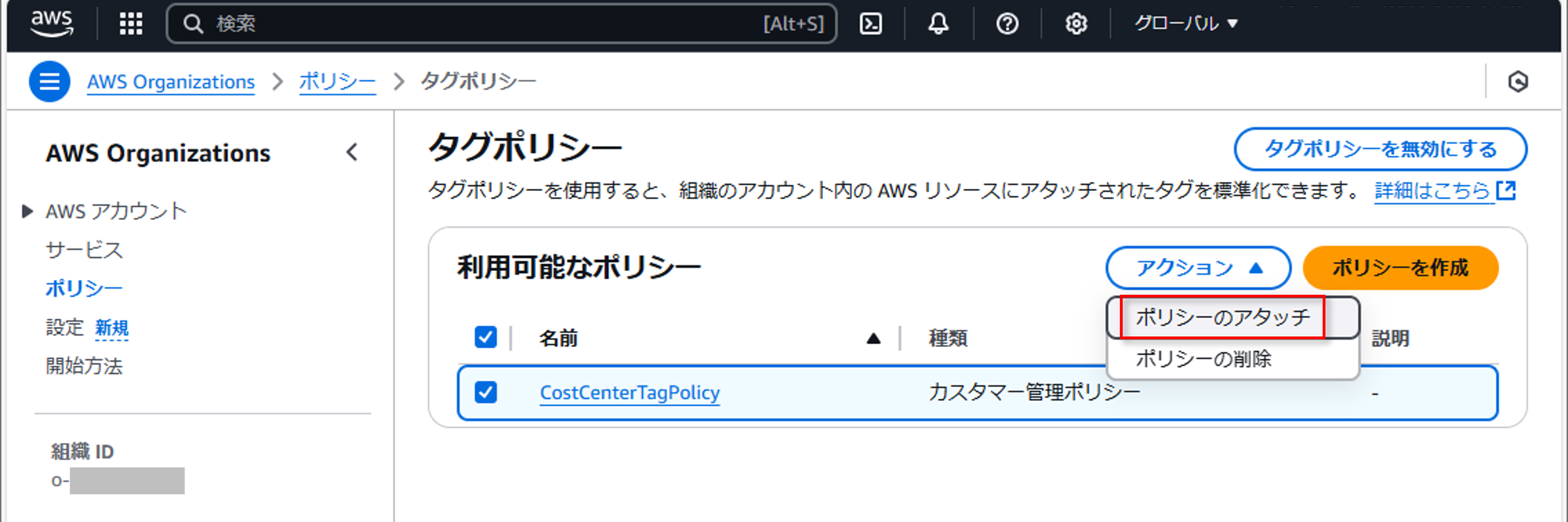 3. この新しく作成されたポリシーを組織全体で確実に適用するには、組織単位 (OU) にポリシーをアタッチする必要があります。そのためには、タグポリシーページに戻り、先ほど作成した “CostCenterTagPolicy” を選択します。次に “Actions (アクション)” を選択し、“Attach policy (ポリシーのアタッチ)” をクリックします。