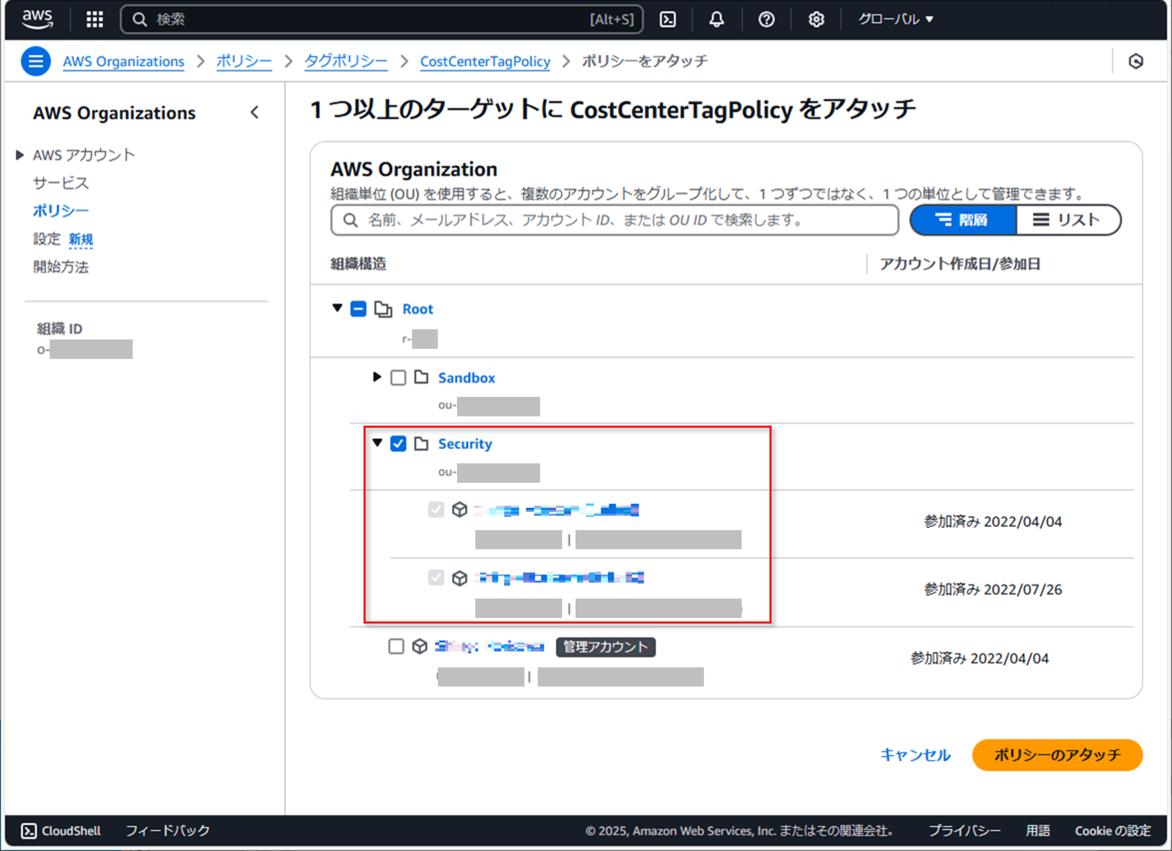 4. 次の画面では、新しいタグポリシーが特定の組織単位 (OU) にアタッチされていることを選択して確認できます。