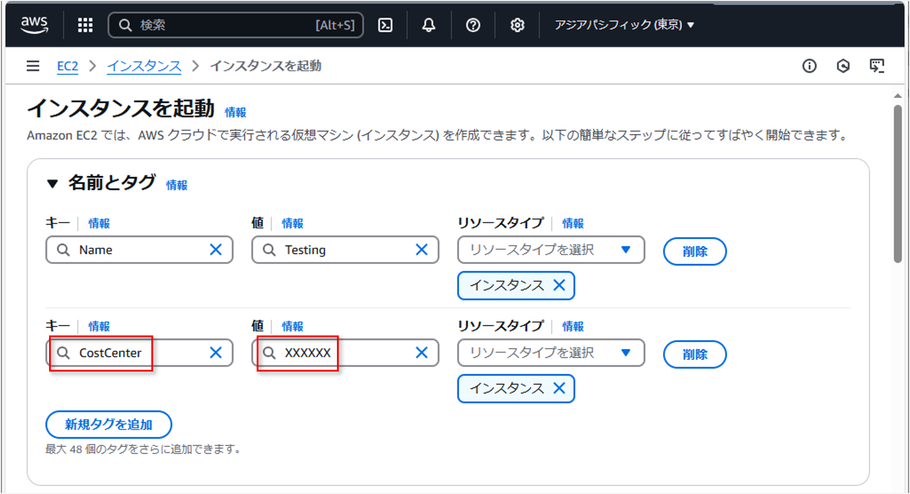 5. それでは、Amazon EC2 コンソールに移動して、適切な CostCenter タグ値を指定せずに新しい Amazon EC2 インスタンスを起動してみましょう。