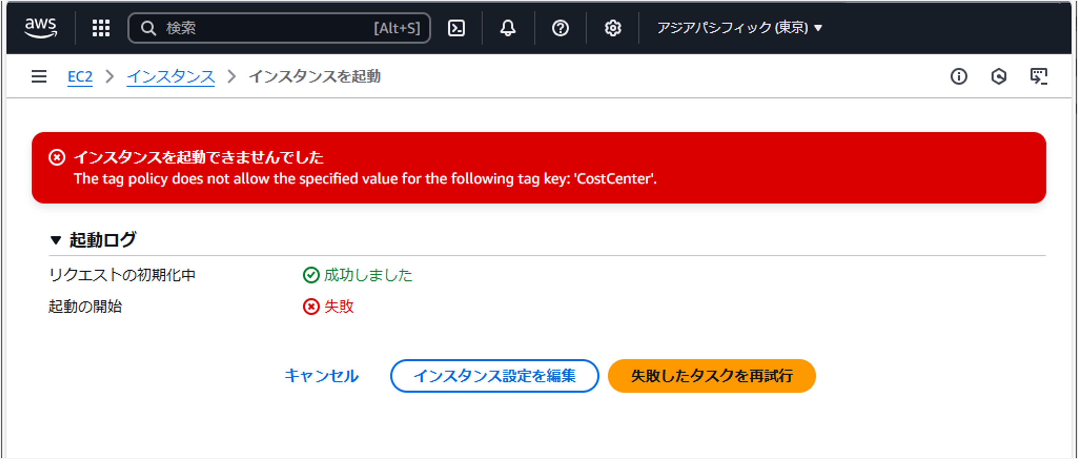 6. 必須のタグポリシー値を指定せずにこのインスタンスを起動しようとすると、エラーが表示されます。
