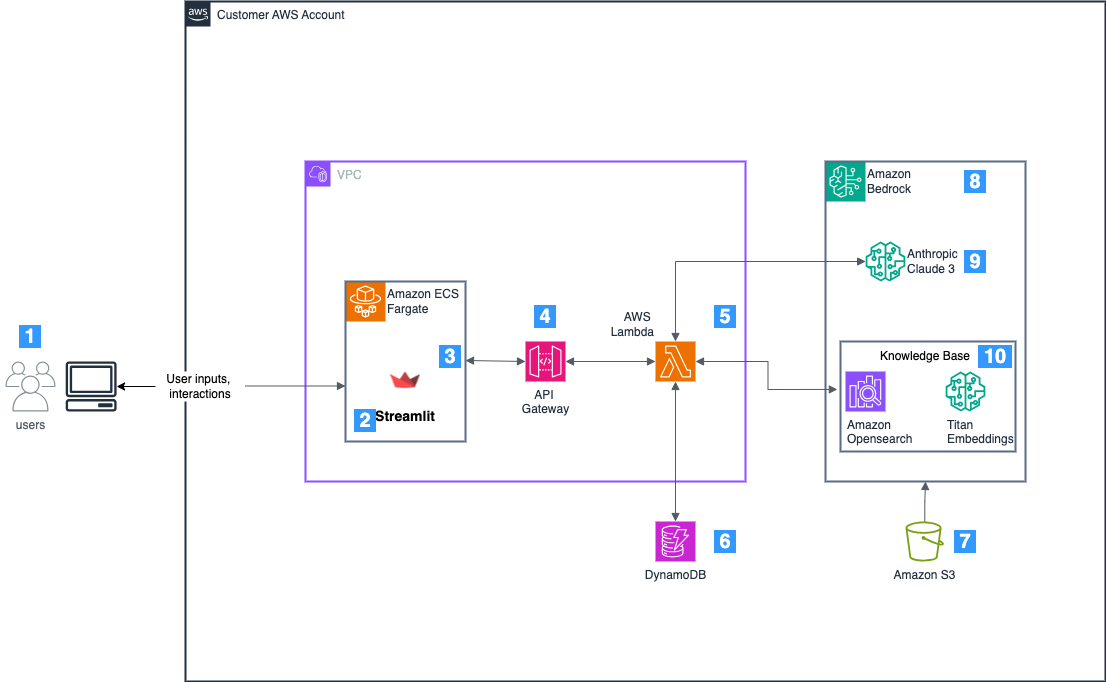 ユーザーは、Streamlit フロントエンド(3)を通してチャットボットアプリケーションとやり取りします。Streamlitは、Python ベースのオープンソースライブラリで、ユーザーフレンドリーでインタラクティブなインターフェースを構築するために使用されています - Amazon Elastic Container Service (Amazon ECS) on AWS Fargate: