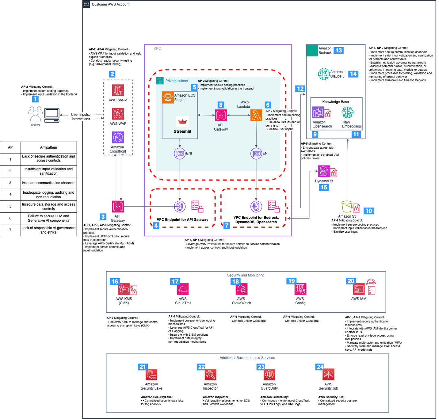 Streamlit アプリケーション (5) は、VPC 内のプライベートサブネットにある Amazon ECS でホストされています。フロントエンドインターフェースをホストし、入力の検証とサニタイズが不十分にならないように、安全なコーディング手法と入力バリデーションを実装する必要があります。その後、ユーザー入力は VPC 内でホストされるサーバーレスコンピューティングサービスである Lambda (6) によって処理され、VPC エンドポイント (7) を介して Amazon Bedrock、OpenSearch、および DynamoDB に接続します。これらの VPC エンドポイントには、アクセスを制御するエンドポイントポリシーがアタッチされているため、Lambda 関数とサービス間の安全なプライベート通信が可能になり、安全でない通信チャネルのアンチパターンが軽減されます。Lambda では、入力バリデーションのアンチパターンに対処するために、厳格な入力バリデーションルール、許可リスト、ユーザー入力のサニタイズを実装しています。
