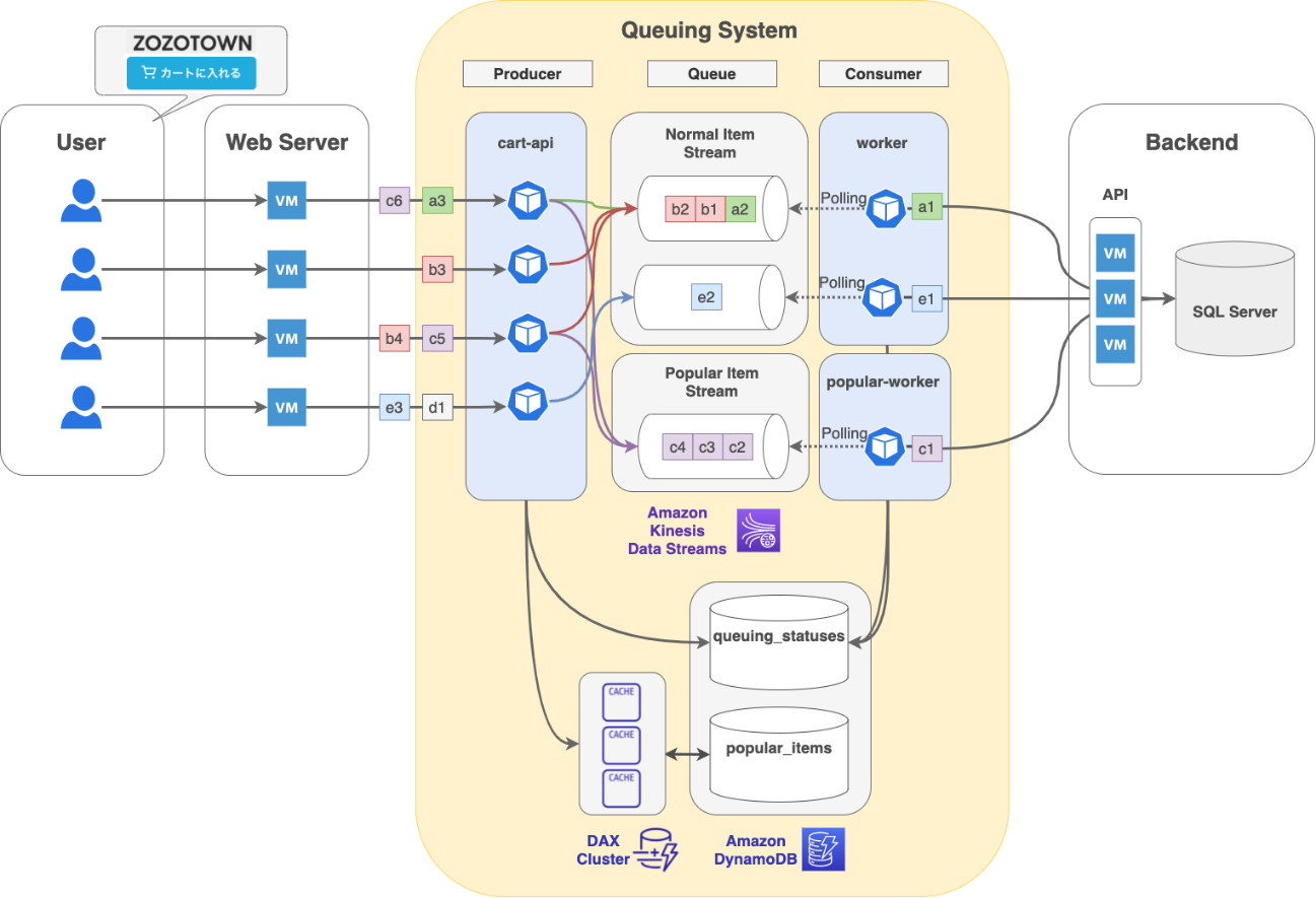 Amazon Kinesis Data Streams(KDS)を挟む構成に変更します。また、人気商品の判定と、リクエストのキューイング状態を管理するために DynamoDB を使用します。