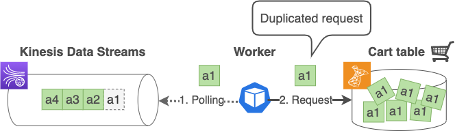 ワーカーは Kinesis Data Streams から同じレコードを複数回取得する可能性があります。したがって、何も制御していない場合、次の図 2 に示すように、1 つのリクエストを複数回実行して、ユーザーがリクエストしたよりも多くの数量をカートに追加する可能性があります。