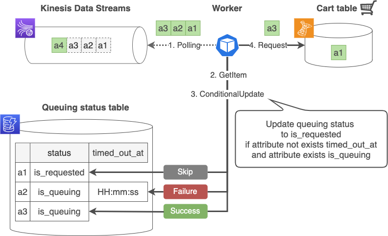 timed_out_atが追加され、ユーザーにエラーが返されます。すでにエラーで停止したリクエストの処理を続行することはできないため、UpdateItemオペレーションを使用し、timed_out_atが存在してはならない条件式を含めます。 - また、Kinesis Client Libraryの仕様により、複数のワーカーが同じシャード内のレコードを処理する可能性があるため、ステータスが