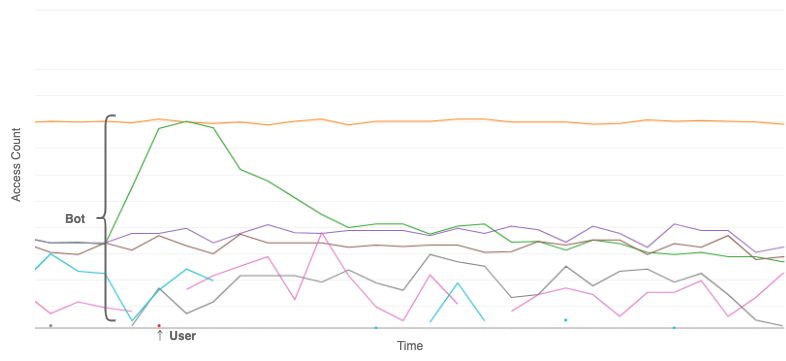 図4のグラフの下部にある「ユーザー」と示している点は、数個の商品を一分間のうちにカートへ投入されたことを示します。これは通常の動作です。ただし、グラフで「Bot」と表示される 毎分数百件の連続するリクエストは、一般ユーザーの挙動とは考えにくく1 つ以上のボットからのものと思われます。ZOZOは、この情報を使用してボットを特定し、適切に対応することができます。