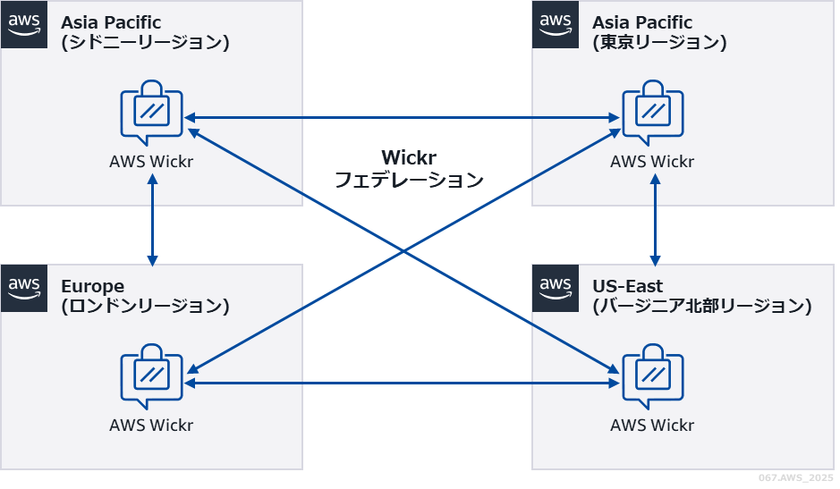 Wickr は現在、アジアパシフィック (シンガポール、シドニー、東京)、カナダ (中部)、ヨーロッパ (フランクフルト、ロンドン)、および米国の米国東部 (バージニア北部) リージョンの AWS リージョンで利用可能であり、2024 年には追加のリージョンが開始される予定です。これにより、確立された同盟国・同志国、新興パートナーとのセキュアなコラボレーションを迅速かつ簡単に設定できます。例えば、次の図に示すように、オーストラリア政府機関は、英国、米国、日本政府の対応機関と Wickr ネットワークフェデレーションを設定できます。