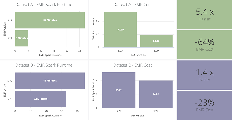 パイプラインの全体的なパフォーマンスの大幅な改善は、Amazon EMR バージョン 5.28 で導入された Apache Spark の Amazon EMR ランタイムの機能を使用したことによるものです。既存のパイプラインに追加の変更を加えることなく、Amazon EMR 5.27 から 5.29 にアップグレードすることで、すぐにパフォーマンスが向上しました。同一のリソース構成を使用した場合、Spark アプリケーションの合計ランタイムとその後の Amazon EMR コストは 35% を超えて削減されました。これらの改善は、2 つのデータセットに対してベンチマーキングされ、3 つの実稼働実行に対して平均化されました。