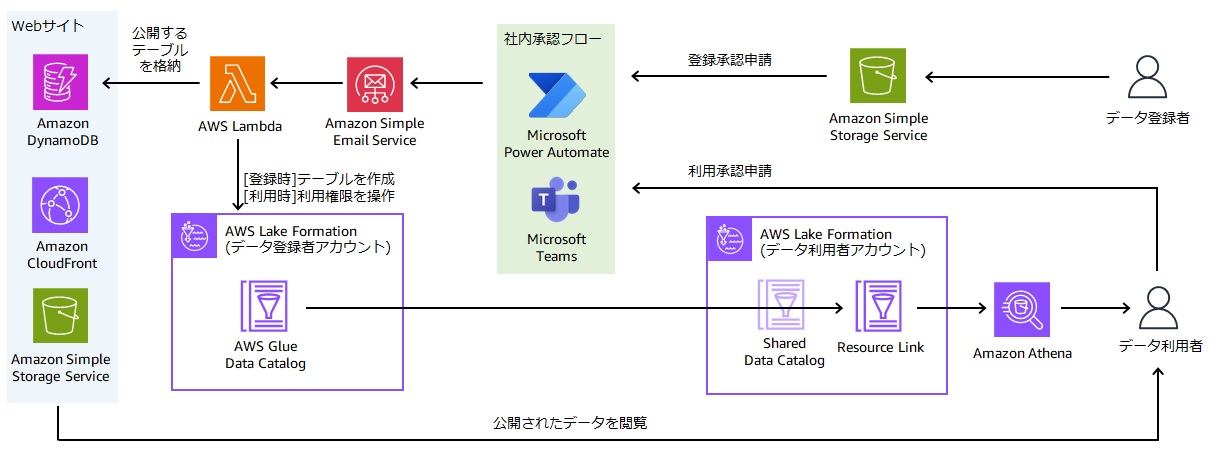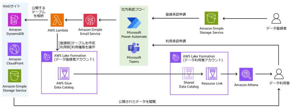 これらの課題を解決するために、AWS Lake Formation と Microsoft Teams の承認アプリを組み合わせて、データ仮想化を実現するデータカタログサイトを開発しました。ここでは、本開発において工夫した点、すなわち、AWS Lake Formation を利用した自動アクセス制御や Microsoft Teams アプリとの連携によるデータ登録 / 利用の承認フロー (以下、社内承認フロー) の自動化、データカタログサイトに登録されたデータのバージョン更新後の後方互換性の確保のために実施した Amazon S3 データ配置ルールについてご紹介します。