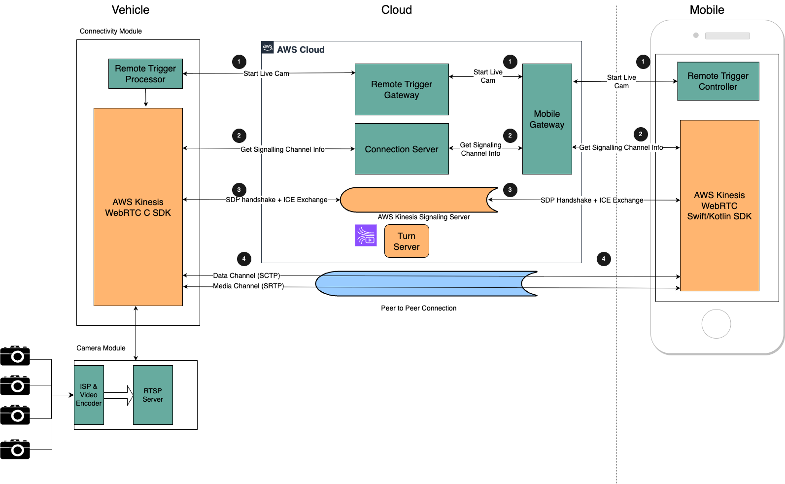 | 4 | 車両は WebRTC SRTP (暗号化) チャネルを介して RTSP ビデオストリームをモバイルに転送します。モバイルは WebRTC データチャネルを介してコマンドを送信し、別の SVS カメラから RTSP ストリームを選択できます。 |