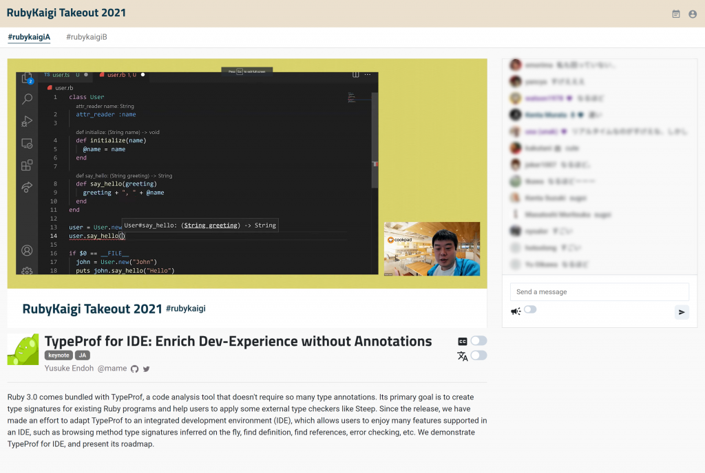 RubyKaigi は日本で開催されている、プログラミング言語 Ruby に関する世界最大級の国際カンファレンスです。長引く COVID-19 の影響で、私たちはオフラインでの開催を諦め、オンラインでの開催を決定しました。2020 年、RubyKaigi Takeout 2020 と称し無料で広く使われているオンラインビデオサイトを使用して初のバーチャルカンファレンスを開催しました。そして、 2 回目のバーチャルカンファレンスとなる今年の RubyKaigi Takeout 2021 では、私たちのニーズにあったバーチャルカンファレンスソリューションを構築し、有料で開催することを決定しました。
