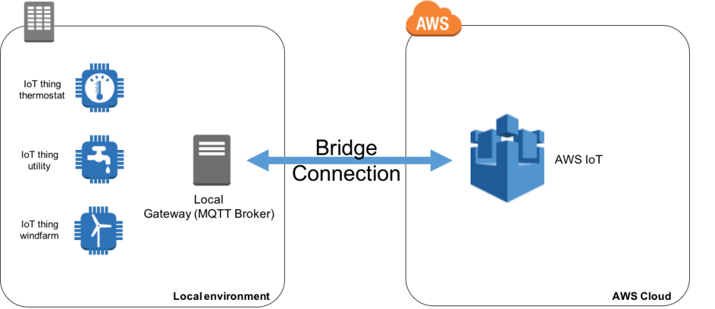 ローカルMQTTブローカーの1つの機能は「ブリッジ」と呼ばれ、MQTTメッセージを交換できるように、ローカルMQTTブローカーをAWS IoTに接続することができます。 これにより、オブジェクトがAWS IoTと双方向で通信し、AWSクラウドの恩恵を受けることができます。