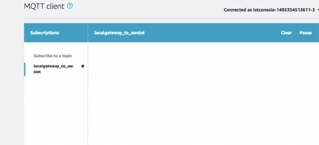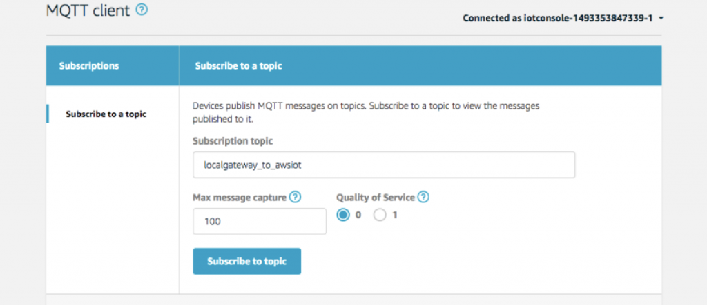 - Subscribeに “localgateway_to_awsiot” を入力し、Subscribe to Topicをクリックします