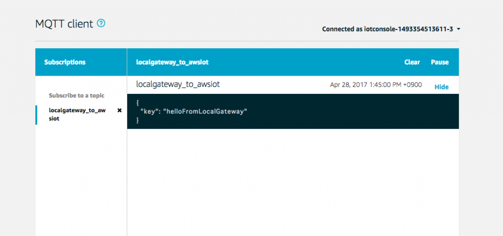 ブリッジにより、AWS IoTに配信されたメッセージが表示されるはずです。