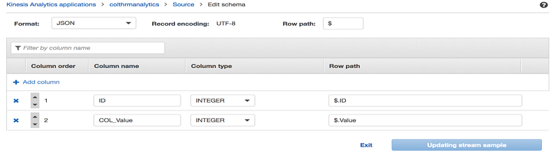Kinesis Data Analytics のスキーマエディタでは、必要に応じてスキーマを編集または変換することができます。以下の例では、2 番目の列を COL_Value ではなく Value に変換しました。