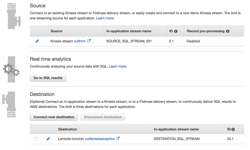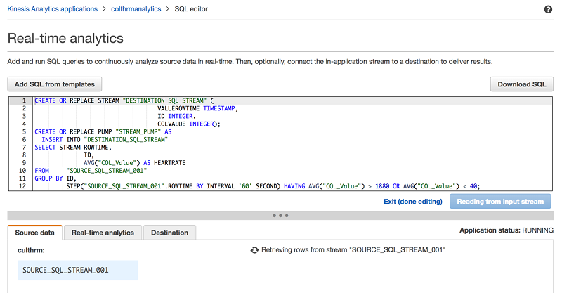 異常な心拍数情報を識別するには、リアルタイムの分析を使って異常な動作を検知する必要があります。Kinesis Data Analytics を使用して、リアルタイムでストリーミングデータの分析を行うことができます。Kinesis Data Analytics は、ソース、リアルタイム分析、および宛先の 3 つの設定可能なコンポーネントで構成されています。詳細な Kinesis Data Analytics の設定手順については、AWS ドキュメントを参照してください。