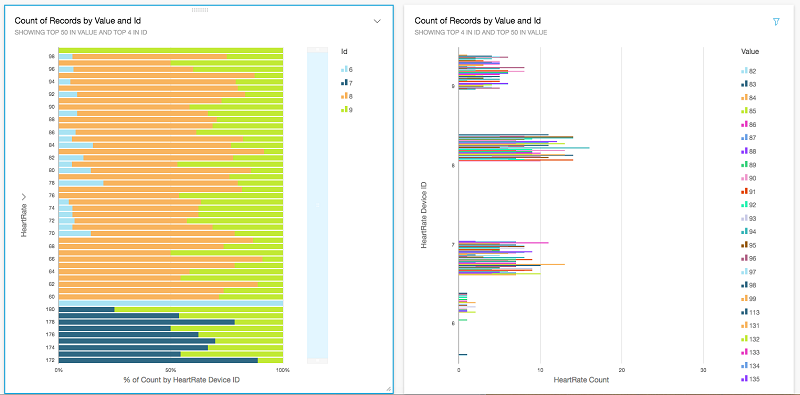 SPICE インポートが完了すると、ビジュアルダッシュボードを簡単に作成できます。以下の図は、デバイスごとの心拍数レコードの頻度を表示するグラフです。 最初のグラフは、デバイスごとに心拍数の頻度の割合を示す水平積み上げ棒グラフです。2 番目のグラフでは、心拍数デバイスに対する心拍数グループを見ることができます。