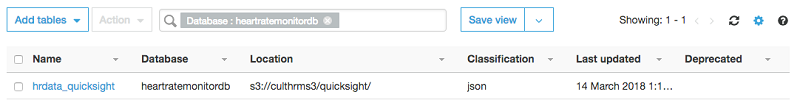 Amazon QuickSight での最初のステップは、新しい Amazon Athena データソースを作成することです。AWS Glue で作成された心拍数データベースを選択し、次に AWS Glue クローラによって作成されたテーブルを選択します。
