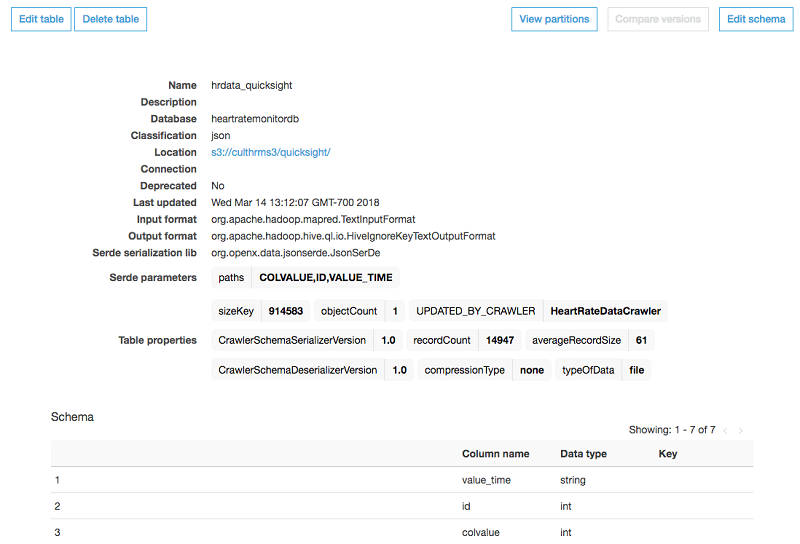 デモのテーブル詳細には、データにタイムスタンプである value_time、人物の ID である id、および心拍数である colvalue の 3 つの属性があります。これらの属性は AWS Glue クローラによって識別され、リストされます。データフォーマット (text) およびレコード数 (レコードサイズがそれぞれ 61 バイトのレコード約 15,000 個) などのその他情報も確認できます。