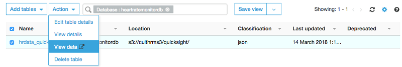 Raw データのクエリには Athena を使用できます。AWS Glue コンソールから直接 Athena にアクセスするには、以下に示すように、テーブルを選択してから、[アクション] メニューで [データの表示] を選択します。