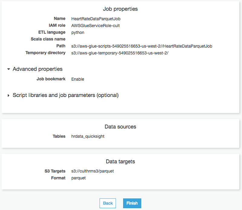 [完了] を選択すると、AWS Glue が Python スクリプトを生成します。このスクリプトはデータを処理して、それをジョブ設定で指定した宛先の S3 バケットにカラムナフォーマットで保存します。