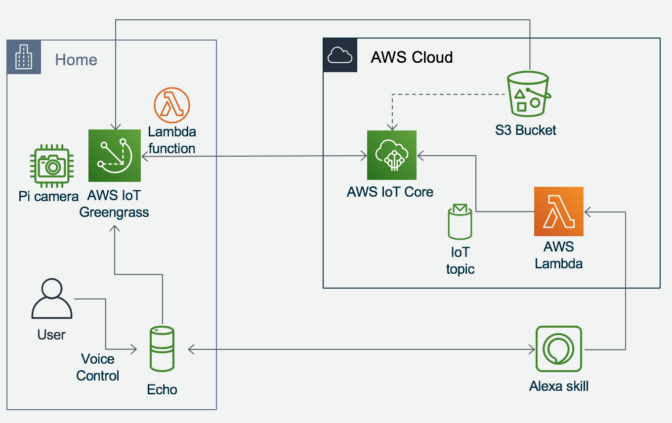 本投稿で説明したアーキテクチャーを示します。 認識用のAWS Lambda関数を作成するために使用される顔認識モデルとデータセットは、Amazon S3バケットにアップロードされています。 AWS IoT Greengrassは必要なファイルをRaspberry Piと同期します。 Echo Dotがトリガーとして実行されます。 Echo Dotが「Alexa、open Monitor」などのコマンドをリッスンすると、Alexaのスキルを呼び出してAWS IoT Coreにメッセージを送信します。 AWS IoT Coreは、Raspberry PiローカルストレージにデプロイされているLambda認識機能を呼び出します。Lambda機能がゲストのIDを認識すると、ドアが開きます。