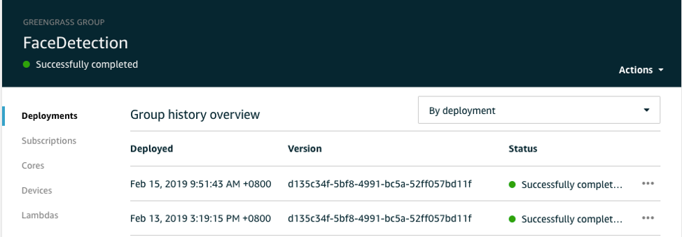 これでGreengrassグループをデプロイできます。 Actionsから、Deployを選択します。 展開時間はモデルのサイズによって異なります。 展開が完了すると、結果がコンソールに表示されます