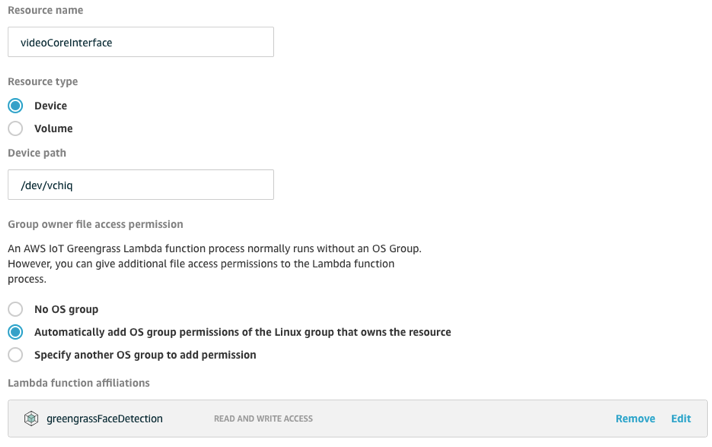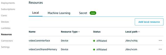 Lambda関数はRaspberry Pi上のいくつかのローカルデバイスを呼び出す必要があります。 これらのデバイスをAWS IoT Greengrassリソースに追加してください。