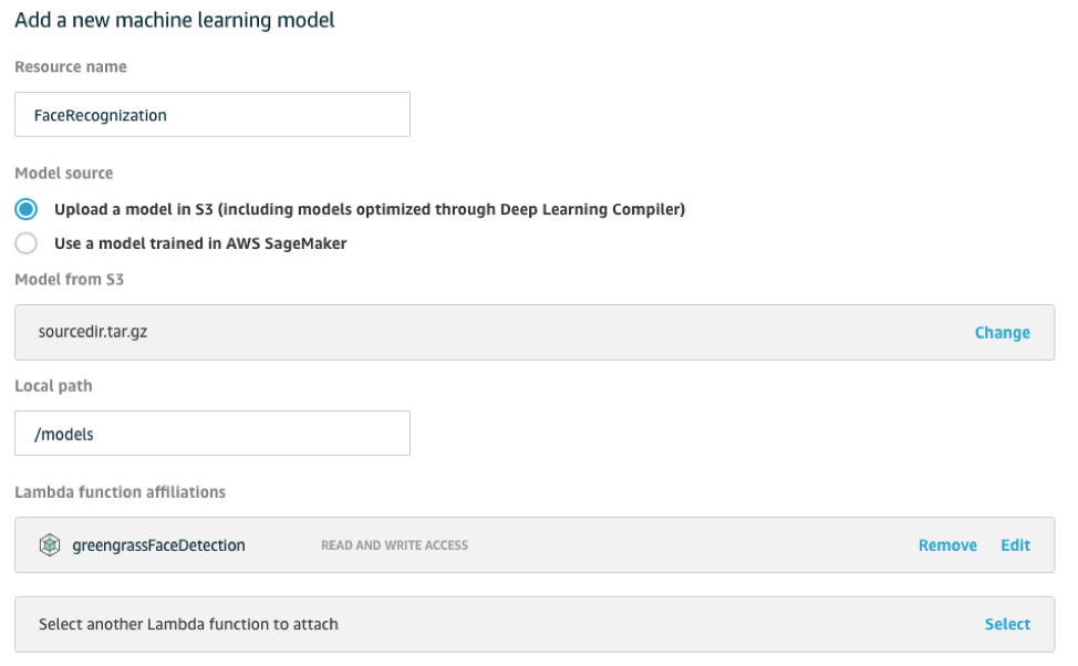 この例では、モデルはS3バケットに格納されています。 Amazon SageMakerを使用してモデルをトレーニングする場合は、モデルソースとしてAmazon SageMakerを選択してください。 ローカルパスは、モデルを保存するエッジデバイス上のディレクトリです。 このパスを慎重に設定してください。 この設定を間違えると、あなたのモデルはエッジデバイスで使用できません。 あなたのモデルがGreengrassグループに追加されたのを確認することができます: