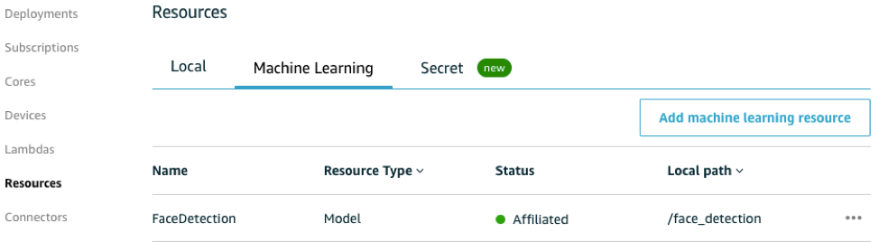 あなたのMLモデルをこのGreengrassグループに追加してください。 左側のナビゲーションペインで、Resource、Machine Learning、Add machine learning resourceの順に選択します。