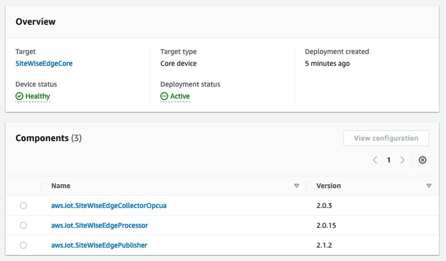 次のスクリーンショットは、データ収集パックとデータ処理パックをデプロイした AWS IoT Greengrass V2 のデプロイメントです。