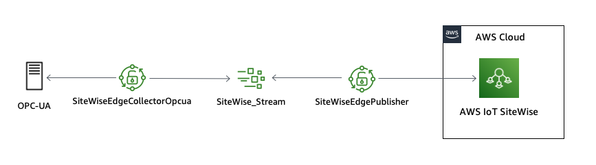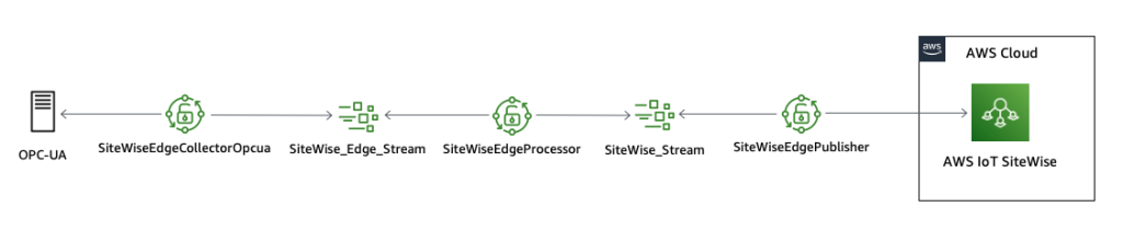 データが AWS IoT SiteWise データストアに取り込まれるまでの流れとしては、データは SiteWiseEdgeCollectorOpcua によって OPC-UA ソースから収集され、ゲートウェイ上の AWS IoT Greengrass ストリーム(デフォルトで SiteWise_Stream )に取り込まれます。 SiteWiseEdgePublisher は、ストリームからデータを読み出し、 AWS 上の SiteWise データストアに転送します。