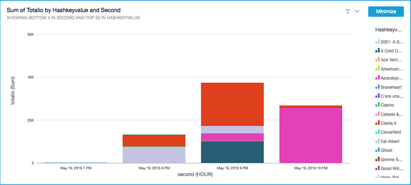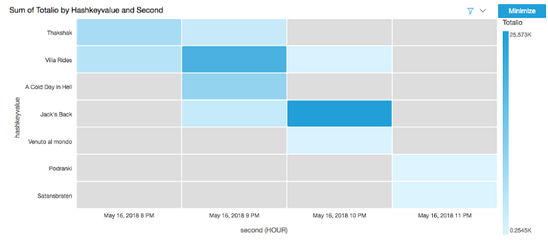 - これでテーブル名、時間範囲、パーティションキーをフィルターしてグラフを作成し、期間内の映画の人気を視覚化できるようになりました。