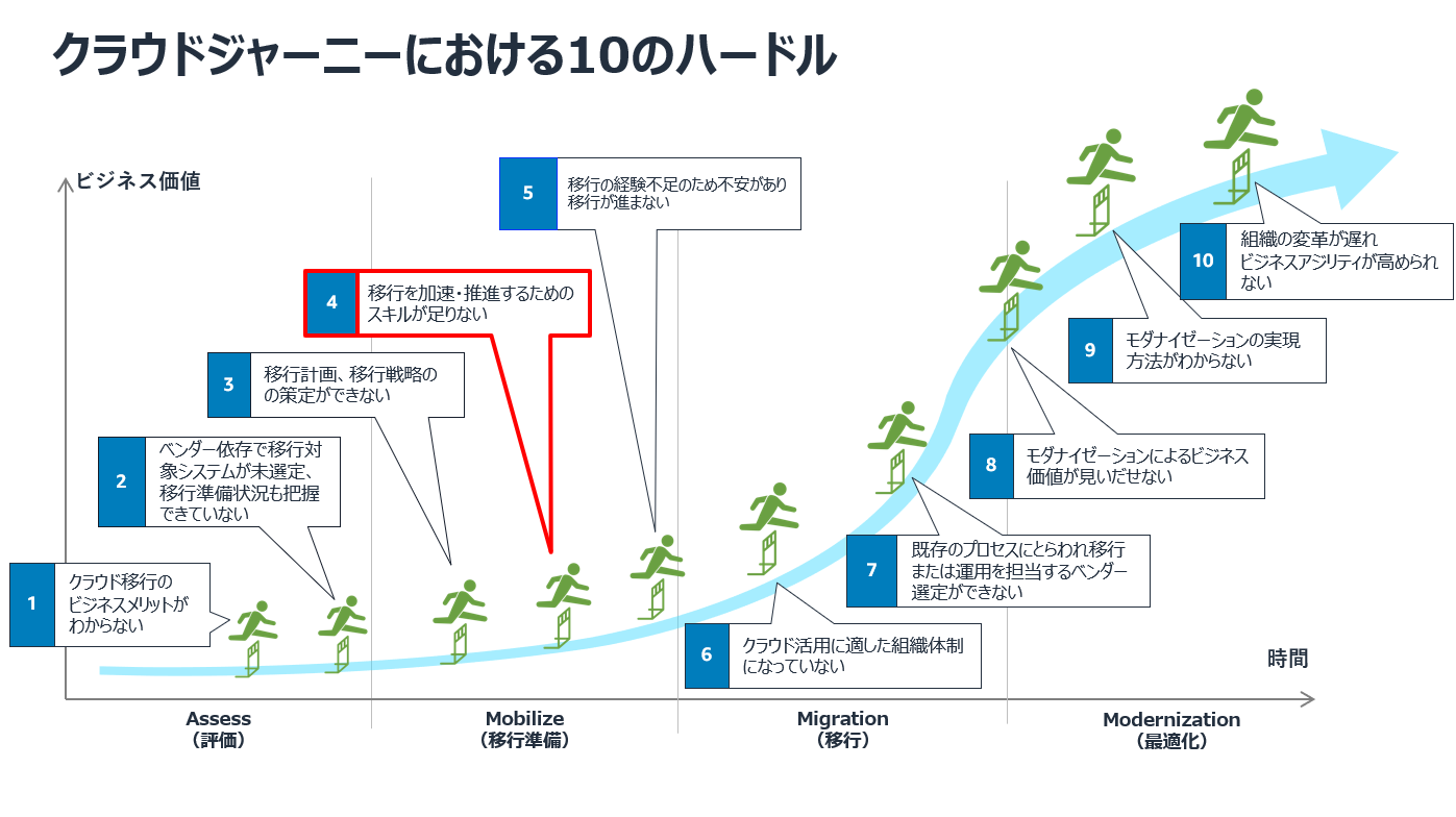 クラウド移行には、4 つのフェーズがあります。Assess (評価) から始まり、移行に向けた課題に取り組む Mobilize (移行準備) 、そして実際の Migration (移行) へと進みます。さらに、クラウド利用によるビジネス価値をより高める取り組みを Modernization (最適化) で実行する流れとなります。それら各フェーズで AWS がご支援する中で、多くのお客様で共通するハードルがあることがわかっています。詳細は下図「クラウドジャーニーにおける10 のハードル」 をご参照下さい。本記事では、 Mobilize (移行準備) フェーズにおいて、クラウド移行を加速・推進するためのスキルが足りないというよくある課題に対しての解決策についてご紹介いたします。