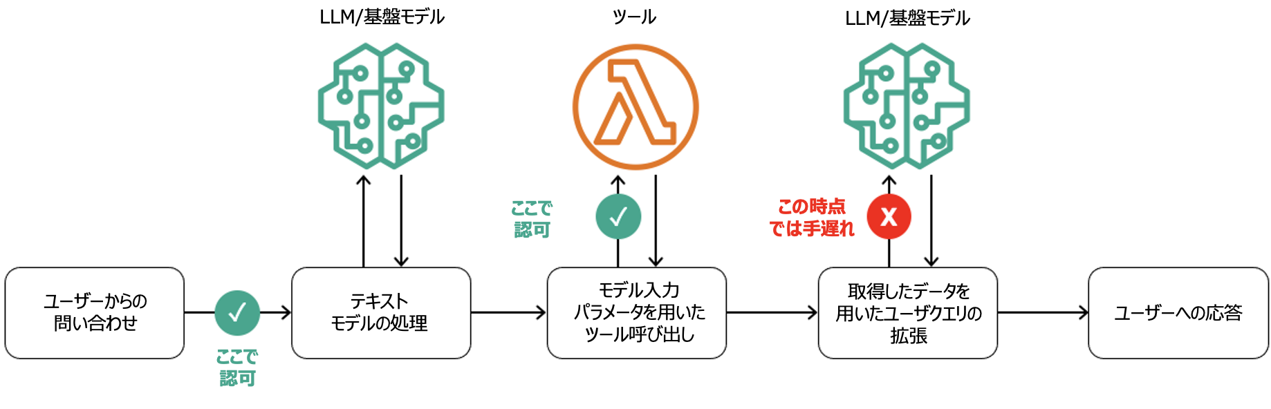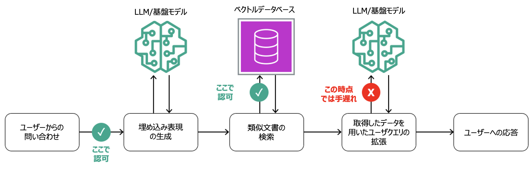 上記およびその他の実装上の考慮事項は重要であり、モデルの出力がリクエストごとに変化する原因となります。出力形式が特定のスキーマに従う従来の機械学習とは異なり、生成 AI 出力は設計上、特定のスキーマに従わないテキスト、画像、動画、音声、その他のコンテンツとして生成される可能性があります。これにより、組織が LLM のトレーニングやファインチューニングに機密データを使用する場合や、RAG やツールなどを通じて LLM へのプロンプトに機密データを追加する場合に課題が生じる可能性があります。例えば、悪意ある攻撃者がプロンプトインジェクションなどの手法を用いて機密データへのアクセスを試みる際に悪用される恐れがあります。したがって、生成 AI アプリケーションと LLM 自体の中でデータがどのようにアクセスされ使用されるかを管理するために認可フローを明確化することが重要です。