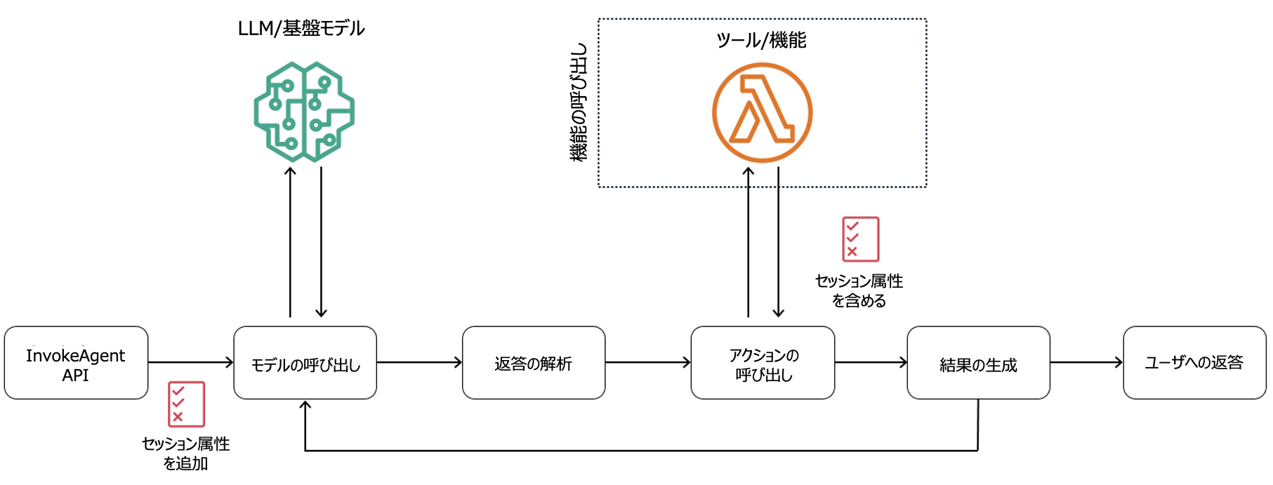 セッション属性には、単純なユーザー ID やグループ名から、ゼロトラストメカニズムやバックエンドシステムへの信頼できるアイデンティティの伝搬で使用される JSON Web Token( JWT )まで、多くの異なるタイプのデータを含めることができます。図 4 に示すように、InvokeAgent API リクエストの一部としてセッション属性を追加すると、エージェントは「アクションの呼び出し」 ステップの一部として、ツールと機能とのセキュアなサイドチャネルを通じてセッション属性を使用します。これにより、プロンプト自体とは別に、ツールと機能にアイデンティティコンテキストを提供します。