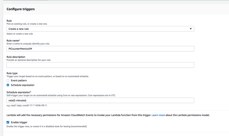 Lambda 関数作成した後、設定を確認します。Lambda 関数は、全種類のイベントでトリガーすることができます。ここでは、5 分毎に Lambda 関数 を実行させます。