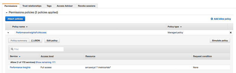 IAM console で、PerformanceInsightsCounterMetricsRole を選択してから、AmazonRDSReadOnlyAccess ポリシーをアタッチします。