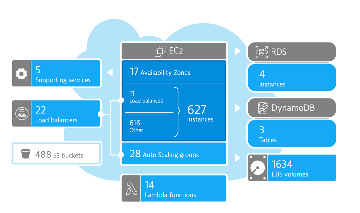 Dynatrace AWS ページには、AWS アカウント内の AWS のサービスの数の概要が表示されます。これは、Amazon アカウントの設定と環境で実行しているサービスによって異なります。次の図は、アカウントの概要ページの例を示しています。図の中央には、17 のアベイラビリティーゾーンに 627 の EC2 インスタンスと 14 の Lambda 関数が示されています。左側には、5 つのサポートサービス、22 のロードバランサー、488 の S3 バケットが表示されています。右側には、4 つの RDS インスタンス、3 つの DynamoDB テーブル、1,634 の EBS ボリュームが表示されています。