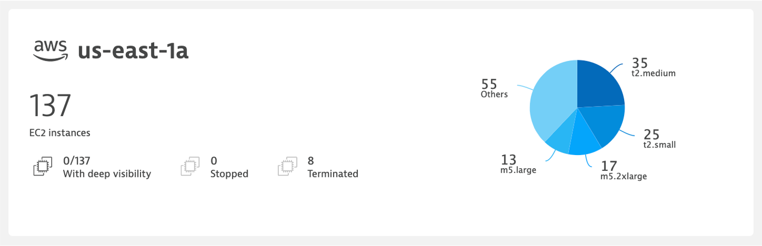 次のスクリーンショットは、選択したリージョン us-east-1a のページの例です。最初のページの上部には、EC2 インスタンスタイプ別の 188 インスタンスの数、サービスの停止状態または終了状態、および詳細な可視性のために Dynatrace OneAgent がインストールされているかどうかが表示されます。右側には、過去 7 日間のアクティブなインスタンスと終了したインスタンスの円グラフが表示されます。次のスクリーンショットを参照してください。