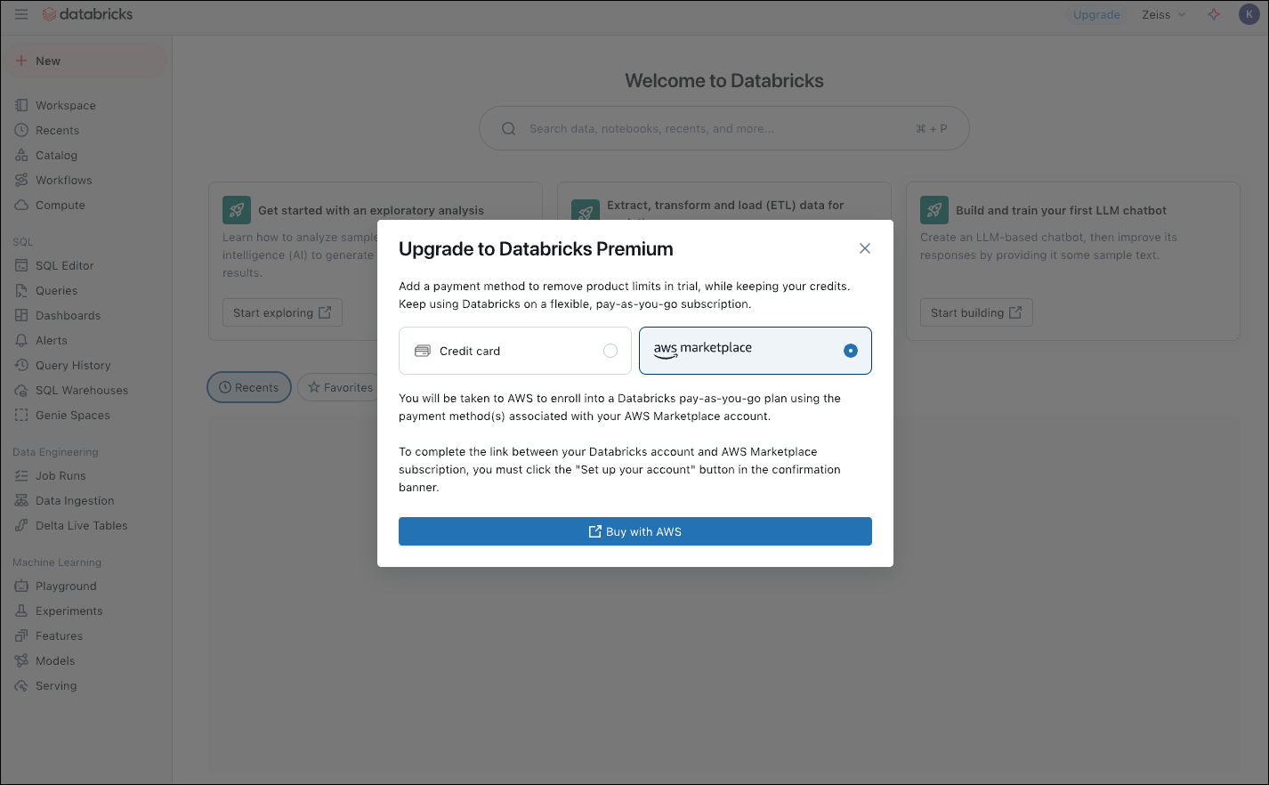 ![AWS Marketplace の [Buy with AWS] 機能を使用して Databricks Premium にアップグレードするオプション](https://d2908q01vomqb2.cloudfront.net/da4b9237bacccdf19c0760cab7aec4a8359010b0/2024/11/24/DB-2.png)